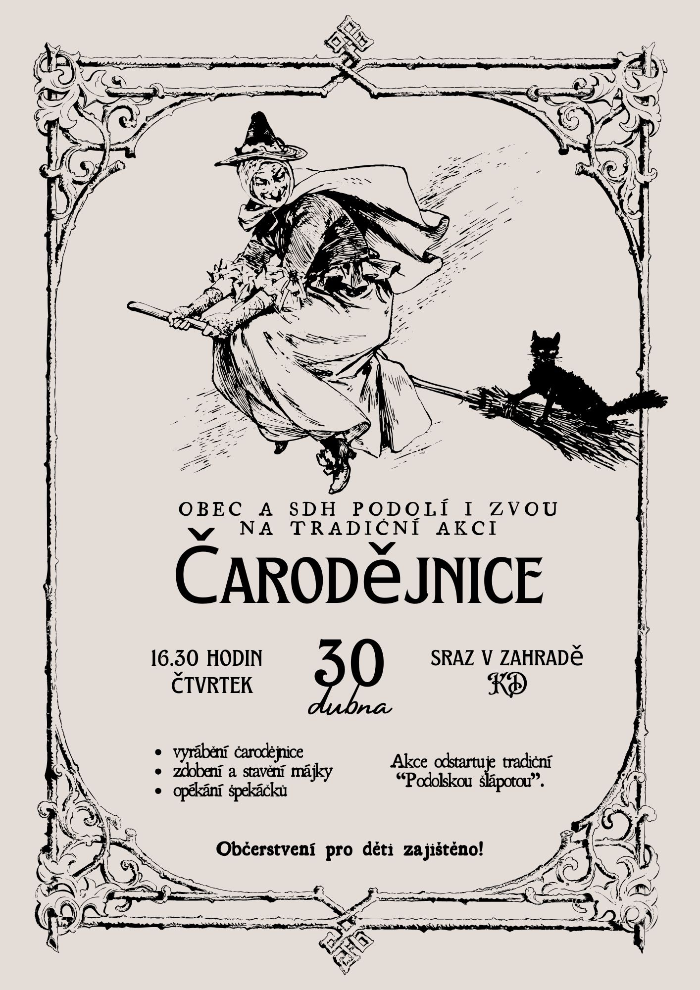 Obec a SDH Podolí I Vás zvou na Podolskou šlápotu a pálení čarodějnic ve čtvrtek 30.4.2026. Sraz v 16:30 hodin v zahradě KD Podolí I.