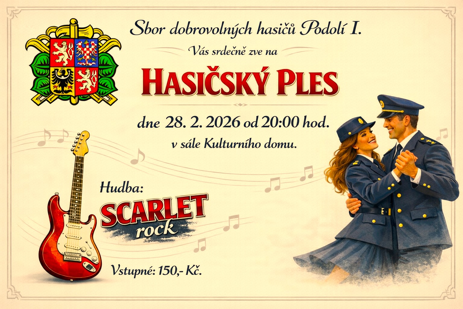 SDH Podolí I zve na hasičský rockový ples se skupinou Scarlet v sobotu 28. 2. 2026 od 20 hodin do KD Podolí I.